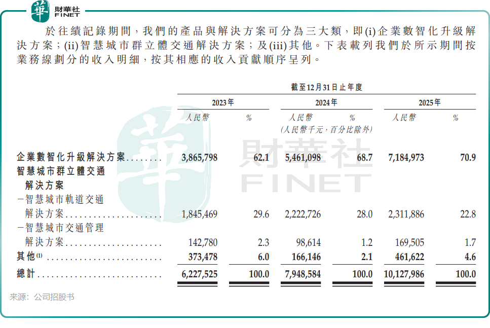 按收入划分,公司主要有两大业务,分别是企业数智化升级解决方案和智慧城市群立体交通解决方案,其中收入主力军是企业数智化升级解决方案,该业务于2025年收入占比达70.9%,该业务以直销+分销模式拓展,主要服务互联网、医疗、金融等行业,过去几年虽然收入持续上升,但盈利贡献弱,2025年毛利率仅3.9%,拉低整体毛利率。