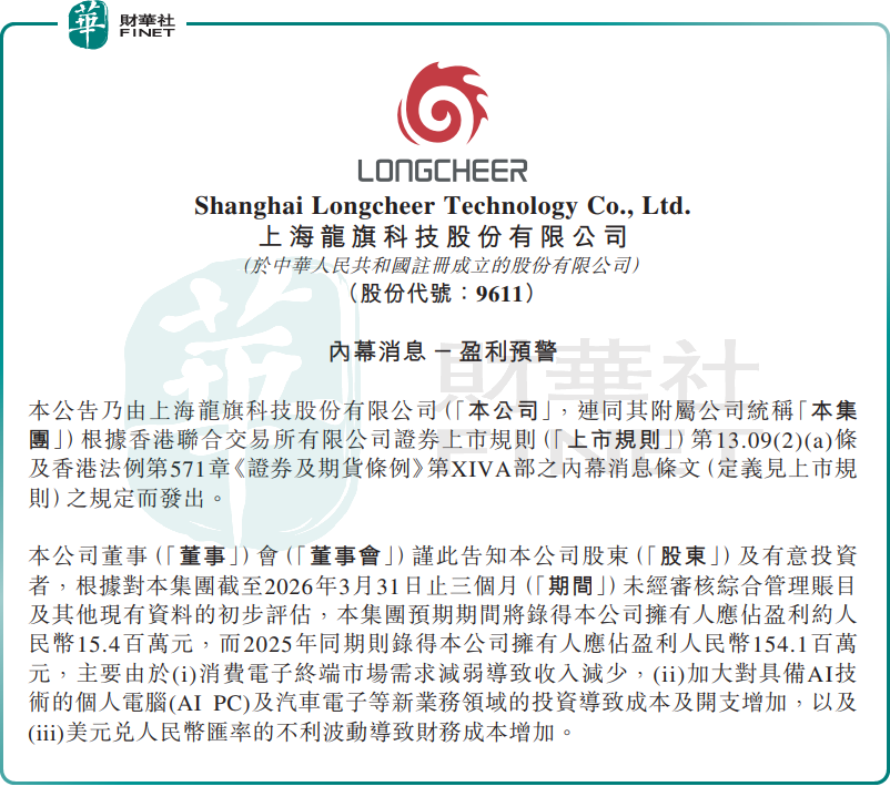 4月21日,龙旗科技发布盈利预警,2026年一季度,预计归母净利润约1540万元(单位人民币,下同),同比下滑约90%,业绩呈现断崖式回落。