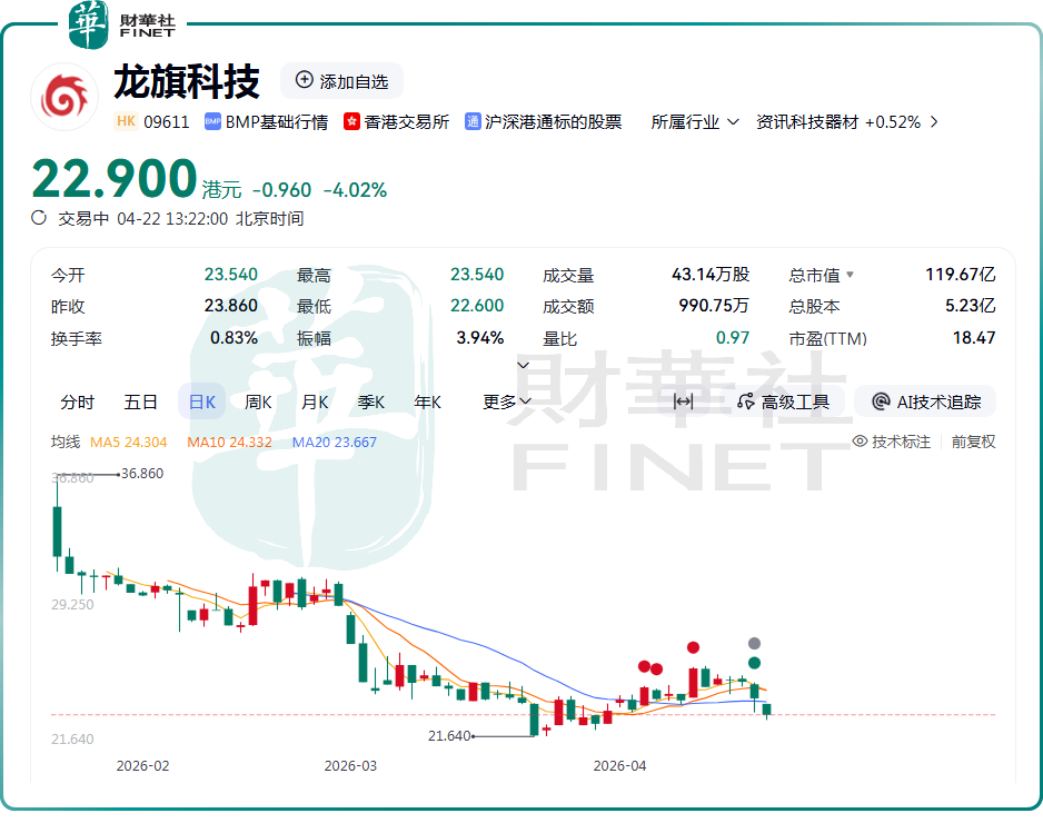 4月22日,全球领先的智能产品和服务提供商——龙旗科技AH两地股价同步陷入低迷,市场情绪偏弱。