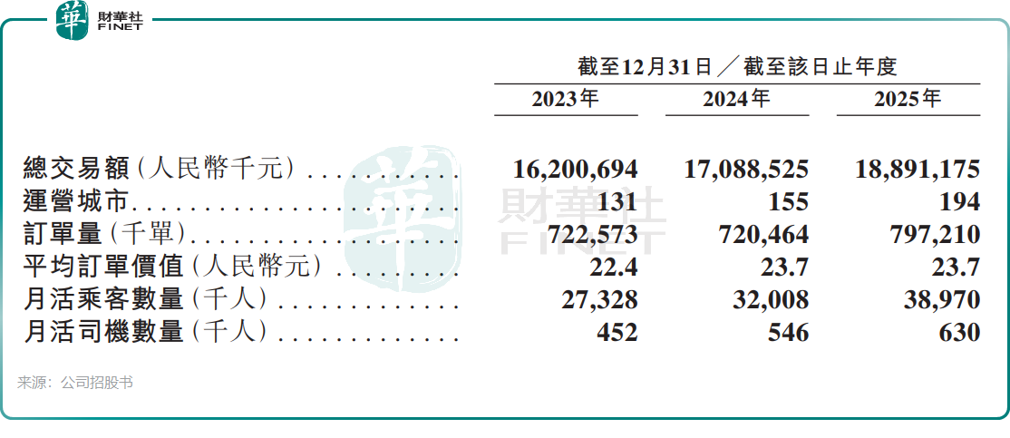截至2025年12月31日,领行科技已在全国194座城市开展业务,服务超过2.345亿名注册用户,注册车辆达140万辆。2025年全年,平台促成订单7.972亿笔,总交易额达189亿元(单位人民币,下同)。根据灼识咨询数据,按2025年订单量计算,公司是中国第三大智慧出行平台。