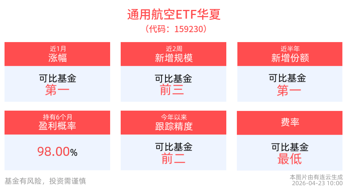 统计显示,近日板块表现强势,通用航空ETF华夏(159230)已连续两个交易日获资金小幅布局,近2周规模增长2751万元。截至4月22日,产品最新规模4.59亿。