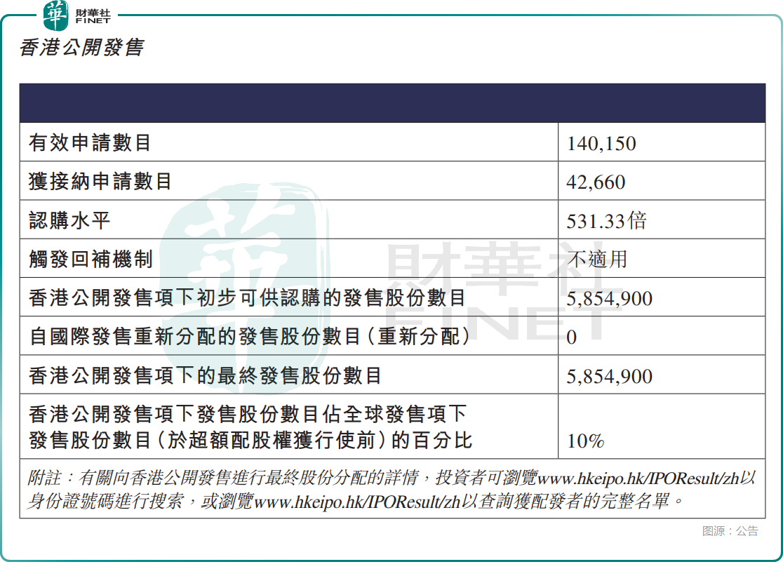 从日前招股阶段的表现来看,香港公开发售方面,华勤技术获531.33倍认购,公开发售的发售股份最终数目为585.49万股,占发售股份总数的约10%。合计获得约14.02万份有效申请,受理申请数目约4.27万份,一手中签率12%。