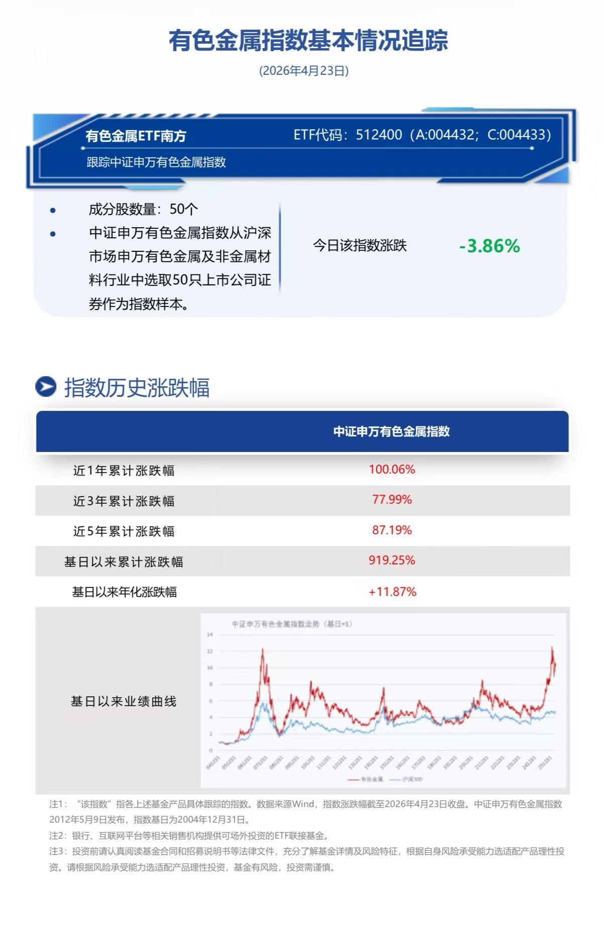 截至2026年4月23日收盘,有色金属ETF南方(512400)换手5.54%,成交16.13亿元,跟踪标的指数中证申万有色金属指数(000819.SH) 跌3.86%。