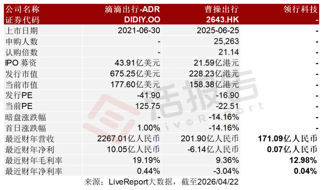 同行业IPO可比公司:滴滴出行-ADR(DIDIY.OO)、曹操出行(2643.HK)