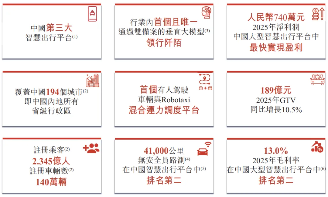 于往绩记录期间,公司的主要服务为向个人乘客及企业客户提供的网约车服务以及其他相关服务。截至2025年12月31日,公司于中国194座城市开展业务,服务超过2.345亿名注册用户。2025年,公司促成7.972亿个订单,总交易额达人民币189亿元。根据招股书,按2025年订单量计算,公司是中国第三大智慧出行平台。