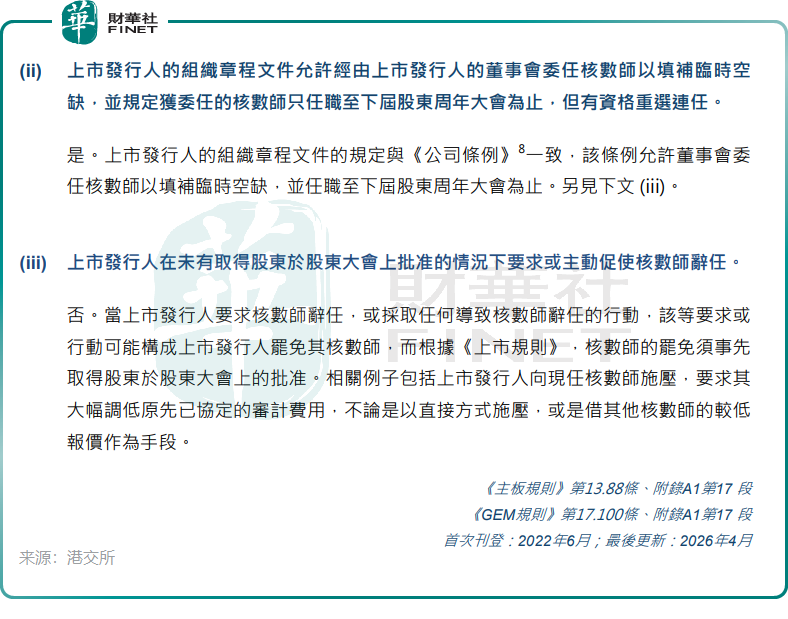 一是现行《上市规则》虽明确审计师罢免须经股东批准,却未将“上市公司要求审计师辞任”纳入同等监管范畴,导致大量公司通过董事会施压审计师主动辞任,规避股东表决程序,实质上架空了股东对审计师任免的核心权力;二是指出联交所此前对上市公司换所原因的审查深度不足,尤其对审计费用分歧的合理性、换所背后未解决的审计问题缺乏持续跟进,给上市公司“购买审计意见”留下了操作空间。
