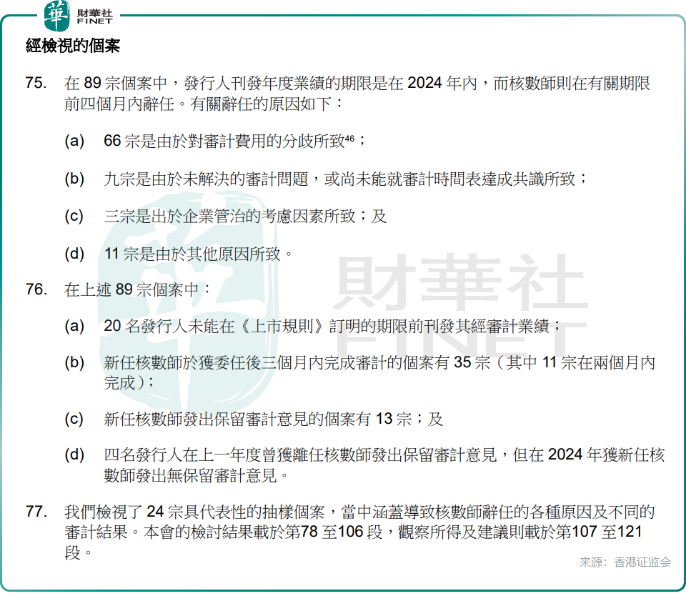 2024年全年的数据暴露了问题的严重性。据香港证监会3月公布的《2025年度检讨报告》显示,在对2024年全年数据的审视中,共有89宗审计师在业绩公布前4个月内辞任的个案。尤为值得警惕的是,这其中多达66宗个案仅仅是因为“审计费用的分歧”导致审计师辞任。相关个案令人关注辞任原因是否真实,以及审计质素会否受到影响。