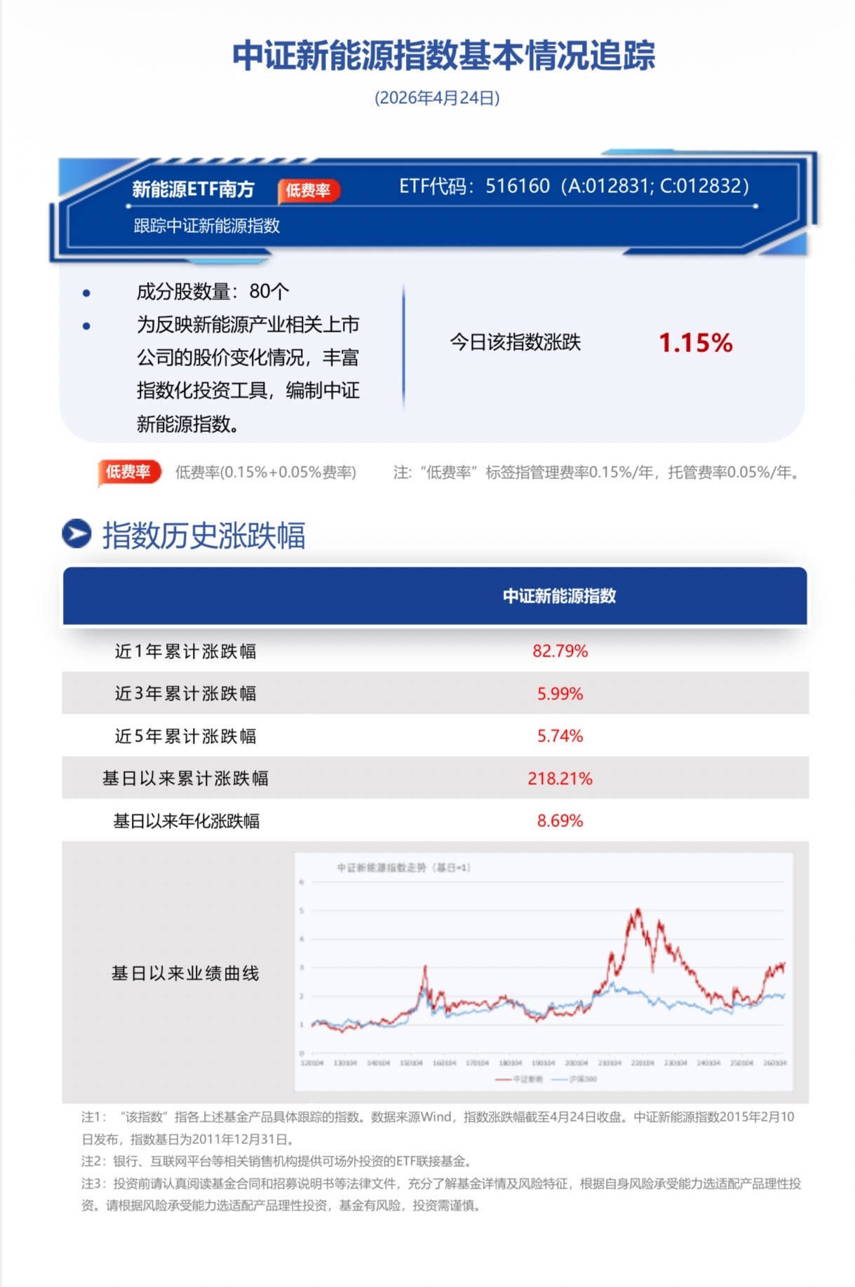 截至2026年4月24日收盘,新能源ETF南方(516160)换手3.47%,成交2.67亿元,跟踪标的指数中证新能源指数(399808.SZ)涨1.15%。