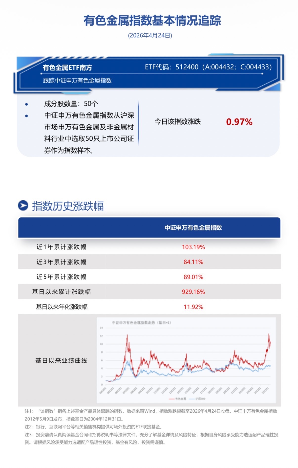 截至2026年4月24日收盘,有色金属ETF南方(512400)换手3.65%,成交10.51亿元,跟踪标的指数中证申万有色金属指数(000819.SH) 涨0.97%。