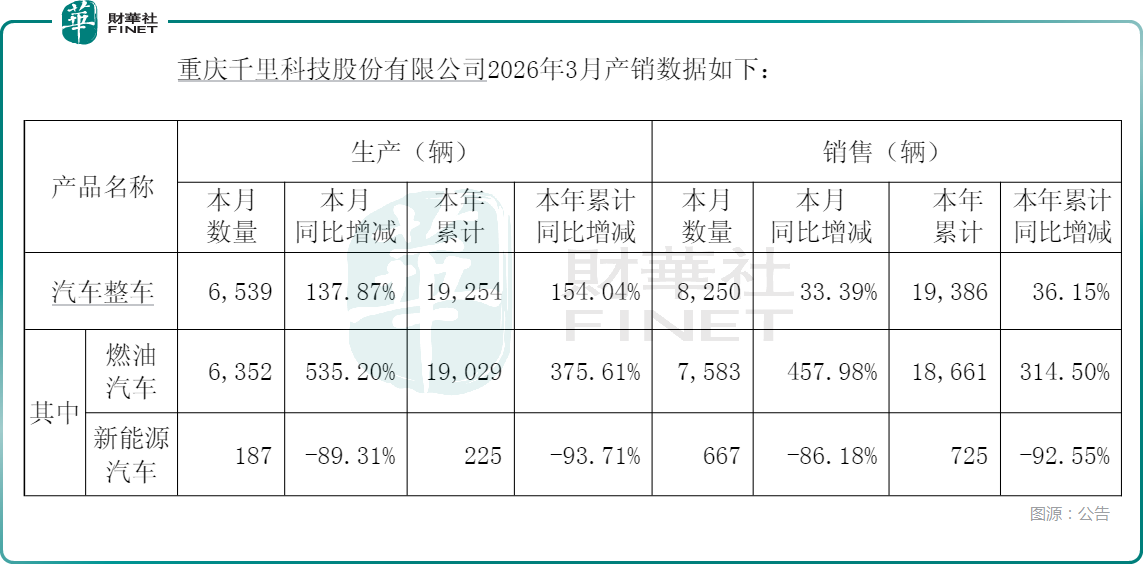 值得一提的是,A股披露的3月产销数据显示,千里科技年内的燃油汽车产销量在大幅增长,而新能源汽车产销量均遭遇暴降,据称系“产线调整”所致,何时能恢复需关注。