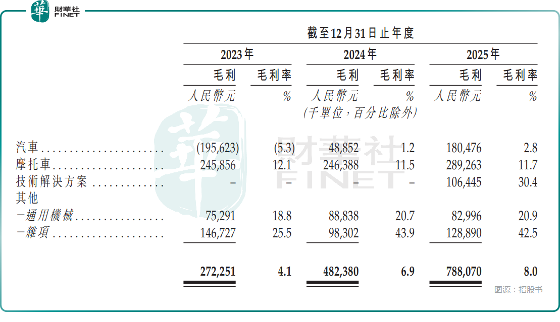 千里科技的摩托车业务(涵盖中大排量车型)反而承担了“现金牛”的角色。摩托车业务的收入从2023年的20.29亿元增至2025年24.78亿元,不过收入占比从30.3%降至2025年的25.1%,2025年的毛利率为11.7%。