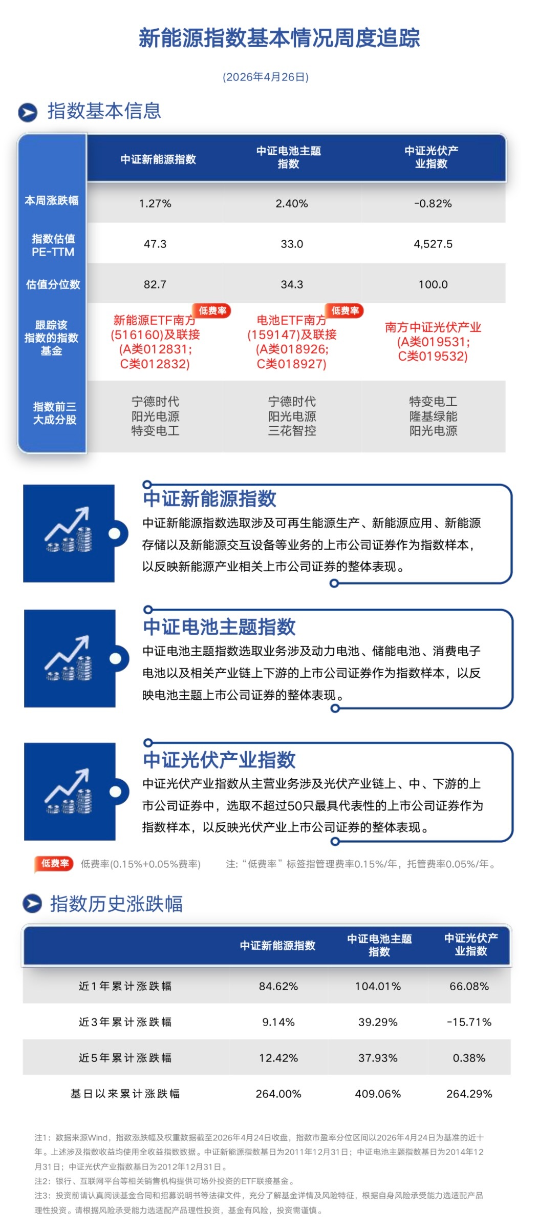 截至本周五收盘,新能源ETF南方(516160)跟踪标的中证新能源指数本周涨1.27%;电池ETF南方(159147)跟踪标的中证电池主题指数本周涨2.40%;南方中证光伏产业(019531)跟踪标的中证光伏产业指数本周跌0.82%。