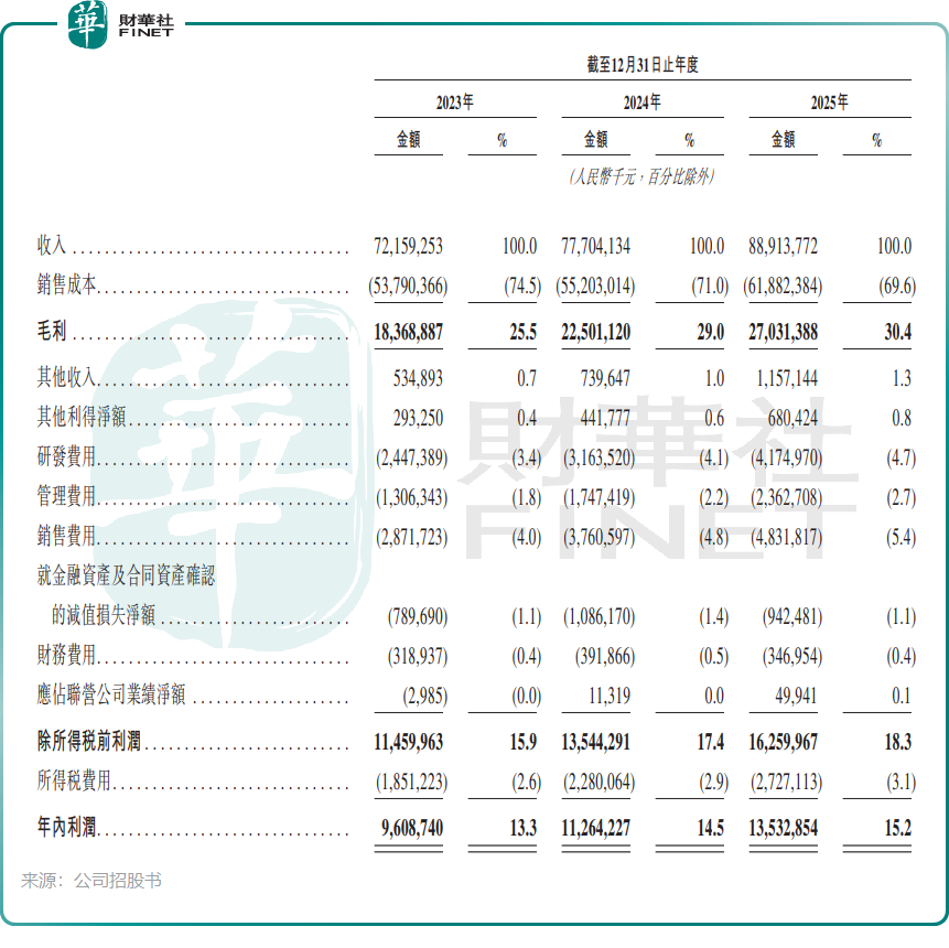 2023年至2025年,阳光电源交出了一份整体稳健的业绩答卷,收入由721.59亿元(单位人民币,下同)增长至889.14亿元、净利润由96.09亿元增长至135.33亿元,毛利率也表现亮眼,由25.5%提升至30.4%,规模效应与品牌溢价的叠加效应正在显现。