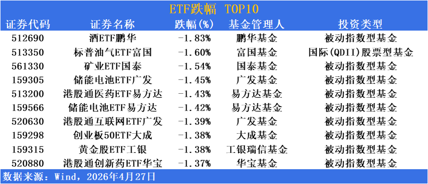 跌幅方面,白酒板块领跌调整,酒类主题ETF跌幅居前