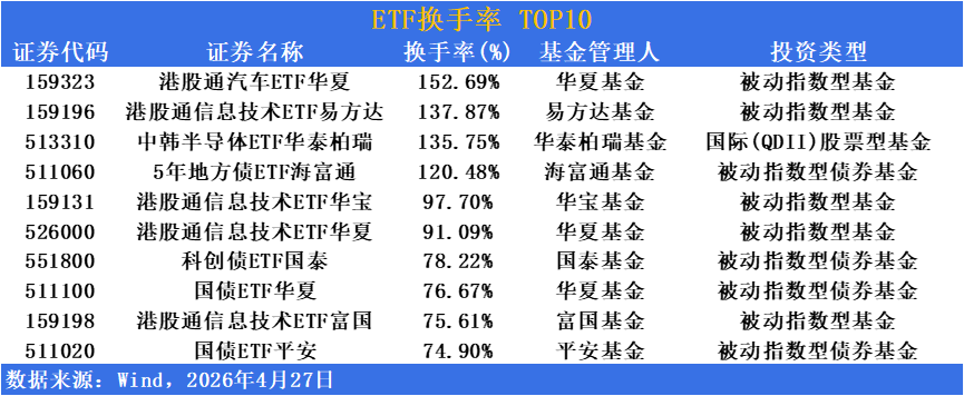 活跃度方面,短融ETF成交超576亿位居榜首,港股通汽车ETF换手率超152%高居榜首