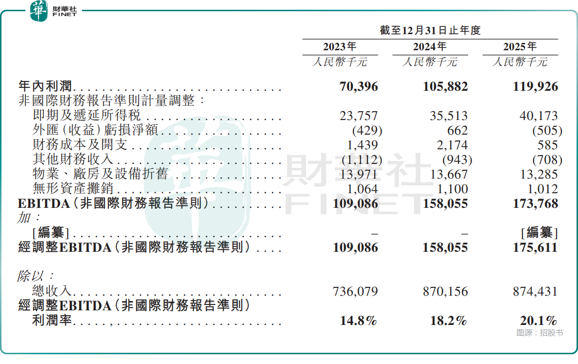 业绩方面,2023年至2025年,卡拉罗的收入分别为7.36亿元(人民币,下同)、8.70亿元、8.74亿元;利润分别为7039.6万元、1.06亿元、1.20亿元;经调整EBITDA分别为1.09亿元、1.58亿元、1.76亿元,增长较为稳健。