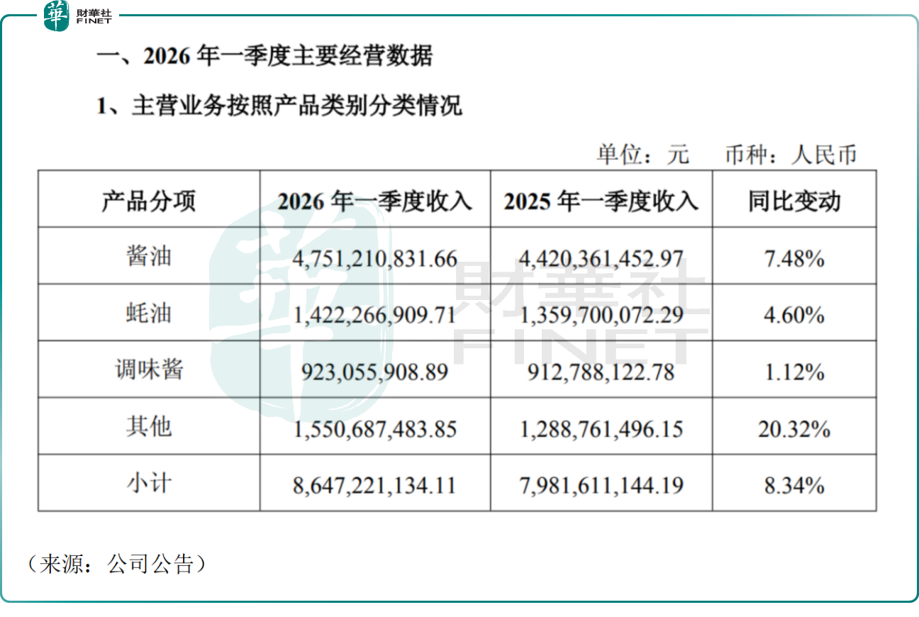 分品类看,核心品类增长稳健。第一季度公司酱油、调味酱、蚝油收入分别为47.51亿元、9.23亿元、14.22亿元,同比分别增长7.48%、1.12%、4.60%。酱油、蚝油依托场景渗透与高端化升级保持稳健,调味酱增速放缓主要受去年同期高基数影响。其他品类收入15.51亿元,同比大增20.3%,复调、醋、料酒等多元化布局成效突出,成为新增长引擎。