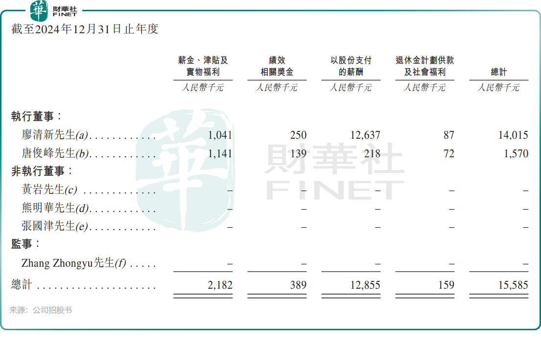 然而,就在公司资金链紧绷的2024年,创始人廖清新却拿到了1401.5万元的总薪酬,其中以股份支付形式发放的薪酬达1263.7万元,占当年公司税前利润的约32%。与之形成鲜明对比的是,同期另一位执行董事唐俊峰的总薪酬仅为157万元。2025年,廖清新的薪酬迅速回落至232.3万元,股份支付也降至89.6万元,回归正常水平。