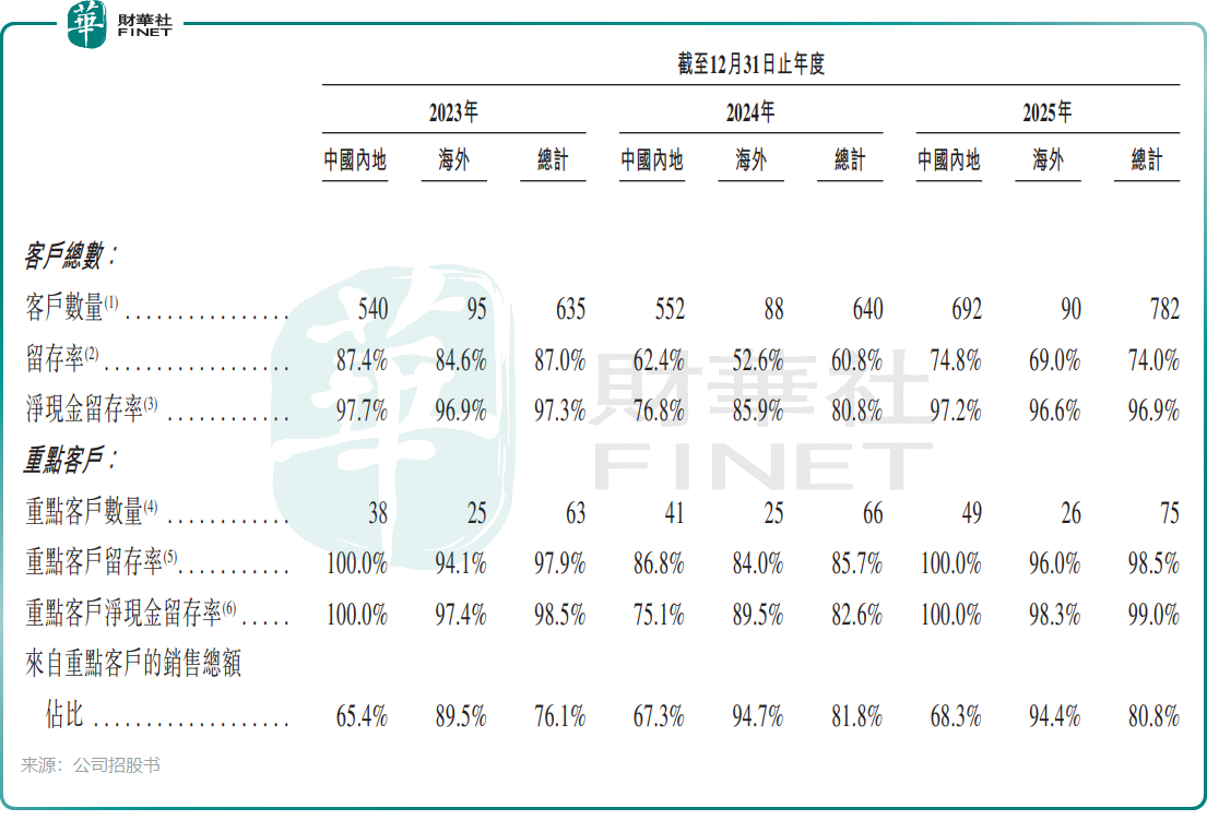客户质量也成为一大亮点。据公司官网及招股书资料,截至2025年底,公司已服务超过80个行业的2700多家企业客户,包括强生、伊利(600887.SH)、中粮、美团(03690.HK)、盒马、百果园(02411.HK)、潍柴(02338.HK)、长城汽车(02333.HK)等多个领域的头部企业均是其客户,2025年重点客户留存率高达98.5%,客户粘性较高。