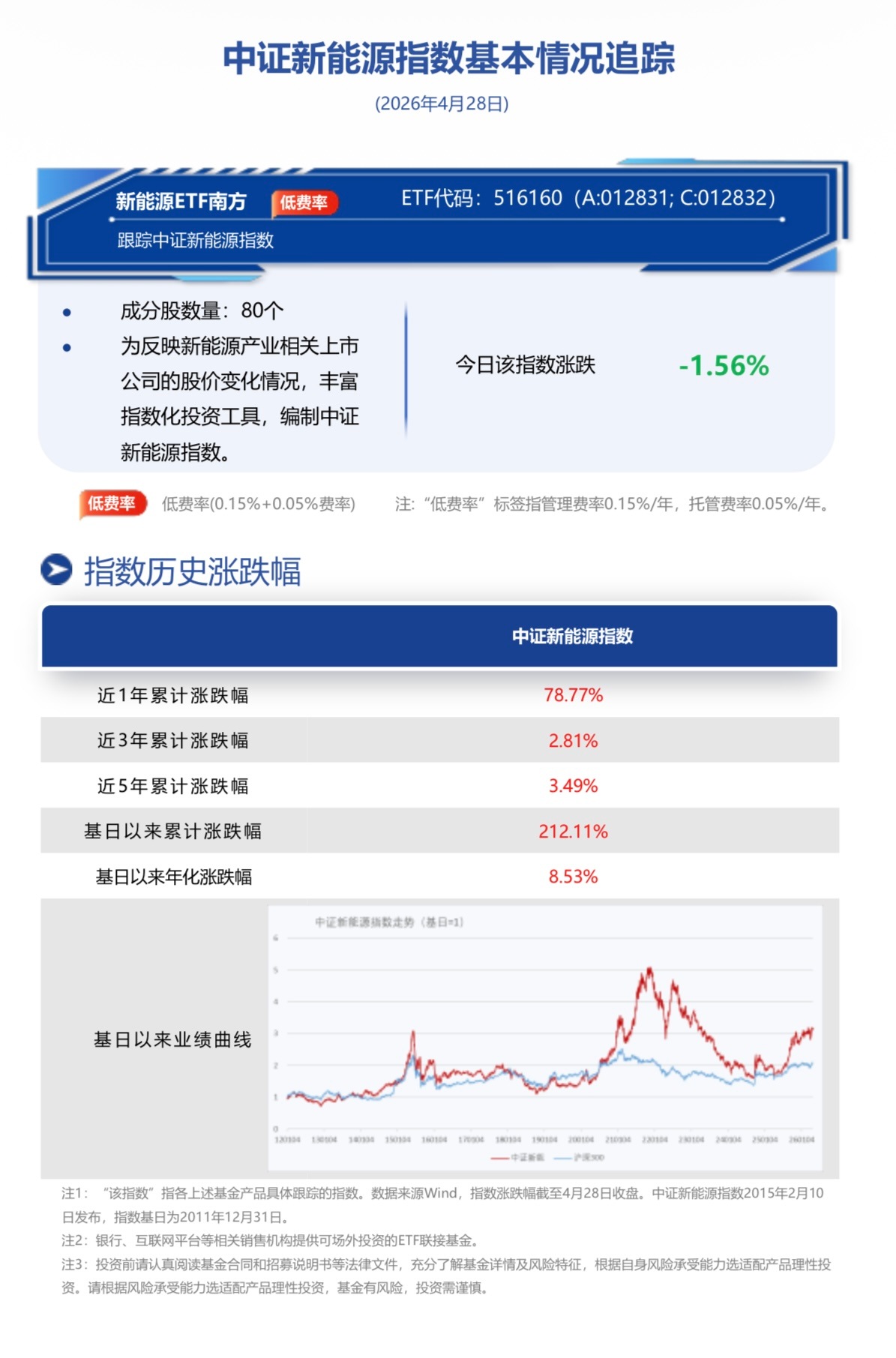 截至2026年4月28日收盘,新能源ETF南方(516160)换手2.77%,成交2.10亿元,跟踪标的指数中证新能源指数(399808.SZ)跌1.56%。