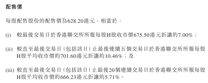 这一配售价较4月27日港股收盘价675.50港元折让约7%,较此前连续五个交易日的平均收市价约701.60港元折让约10.46%。按照公告,此次配售的6238.5万股新H股相当于扩大后已发行H股数目的约28.58%,占已发行股份数目(不包库存股)的约1.36%。