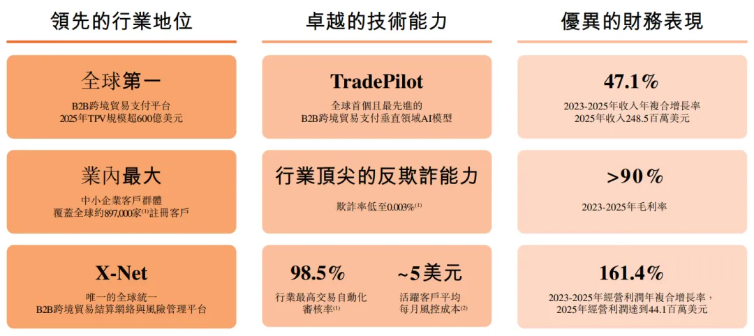 作为一家科技驱动型企业,公司通过TradePilot进一步提升平台能力。根据招股书,TradePilot是全球首个且最先进的B2B跨境贸易支付垂直领域AI模型。截至2026年3月31日,通过TradePilot,公司实现了约98.5%的行业最高交易自动化审核率,并将欺诈率控制在约0.003%的行业极低水平,同时确立了行业内最优成本效益的风险管理实践之一。