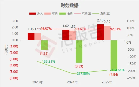 净利分别约为美元-1.53亿、-3.53亿、-4.84亿,2025年同比+36.96%;