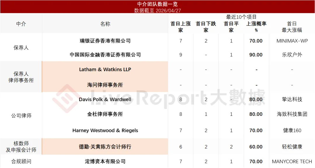 据LiveReport大数据统计,Extransfer中介团队共计9家,其中保荐人2家,近10家保荐项目数据表现值得肯定;公司律师共计3家,综合项目数据表现良好。整体而言中介团队历史数据表现尚可。