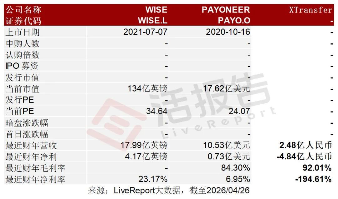 同行业IPO可比公司:WISE(WISE.L)、PAYONEER(PAYO.O)