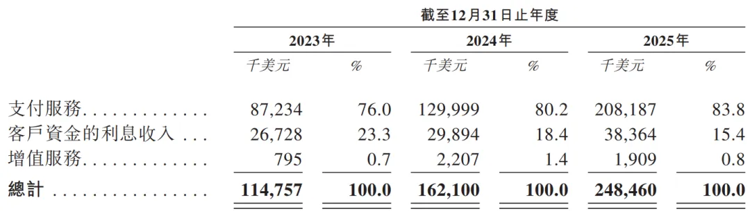 公司收入主要来自B2B跨境贸易支付服务,其中收款、资金汇兑、转账及提现等核心支付服务为收入最重大来源,客户资金利息收入次之,财资管理、软件服务等增值服务收入占比较小。