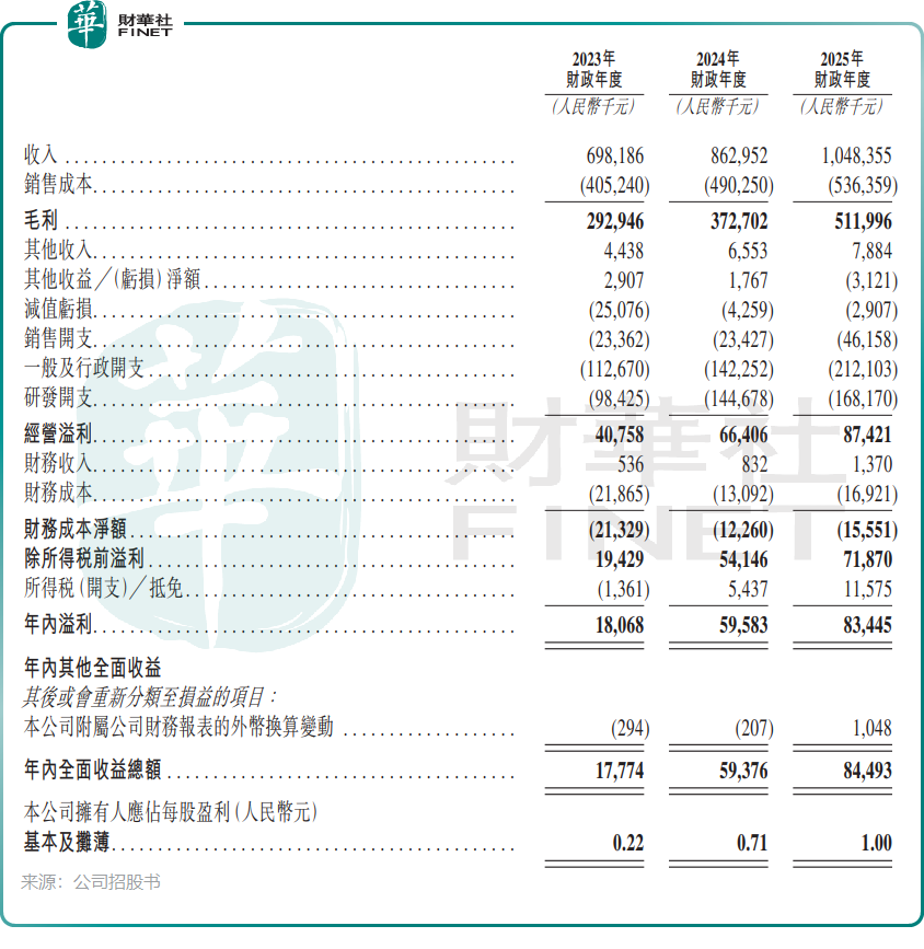 “火”的一面是堪称惊艳的增长曲线。2023年至2025年,公司营收从6.98亿元(单位人民币,下同)增长至10.48亿元,复合年增长率达22.5%。更亮眼的是盈利能力,毛利率从2023年的42%一路提升至2025年的48.8%,这主要得益于高毛利的软件与技术服务占比提升、规模效应带来的成本下降,以及产品结构向高端新能源、半导体领域升级。
