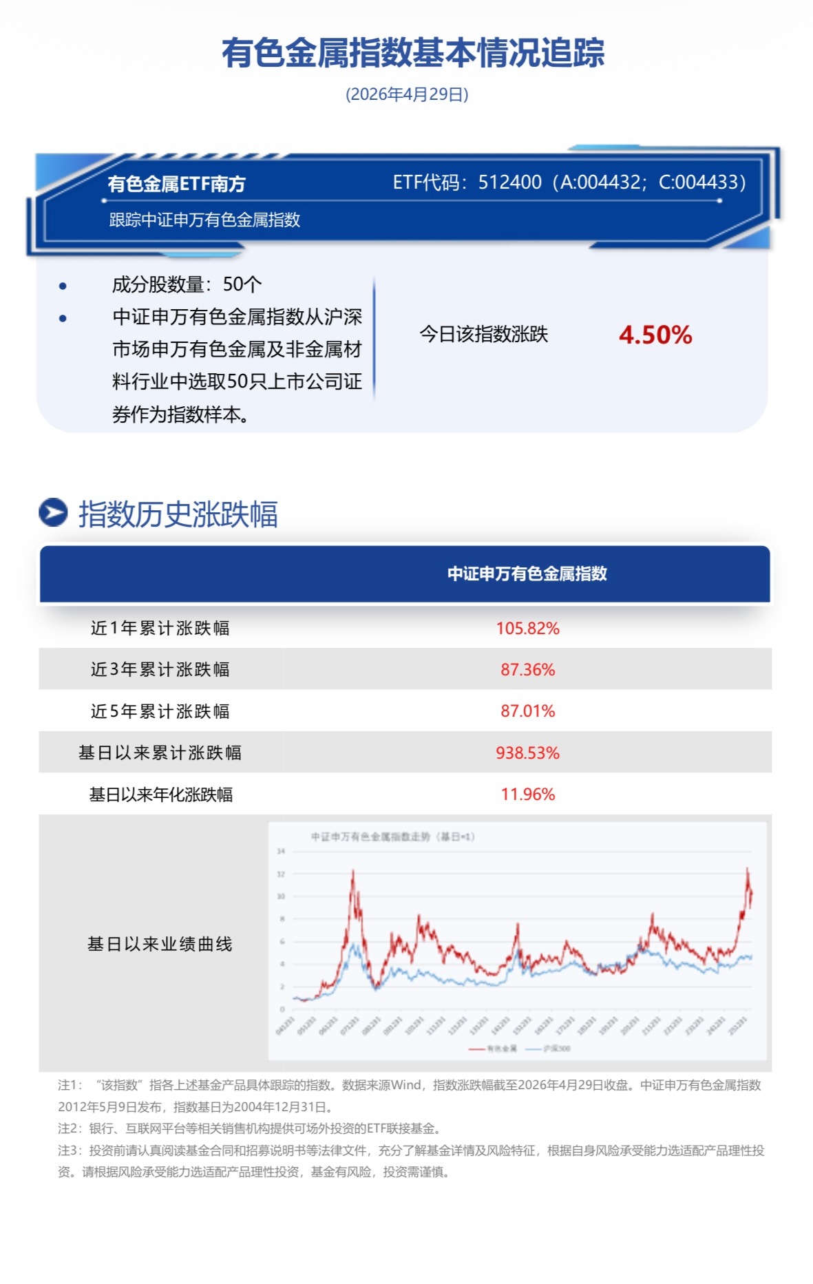 截至2026年4月29日收盘,有色金属ETF南方(512400)换手4.19%,成交11.86亿元,跟踪标的指数中证申万有色金属指数(000819.SH) 涨4.50%。