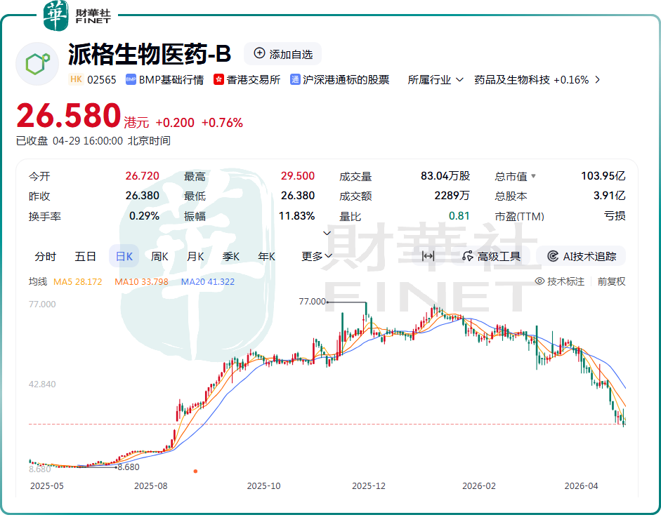4月29日,沉寂已久的派格生物医药-B(02565.HK)股价有所反弹,盘中一度拉涨11.83%;截至收盘,该股涨幅收窄至0.76%,报26.58港元/股。