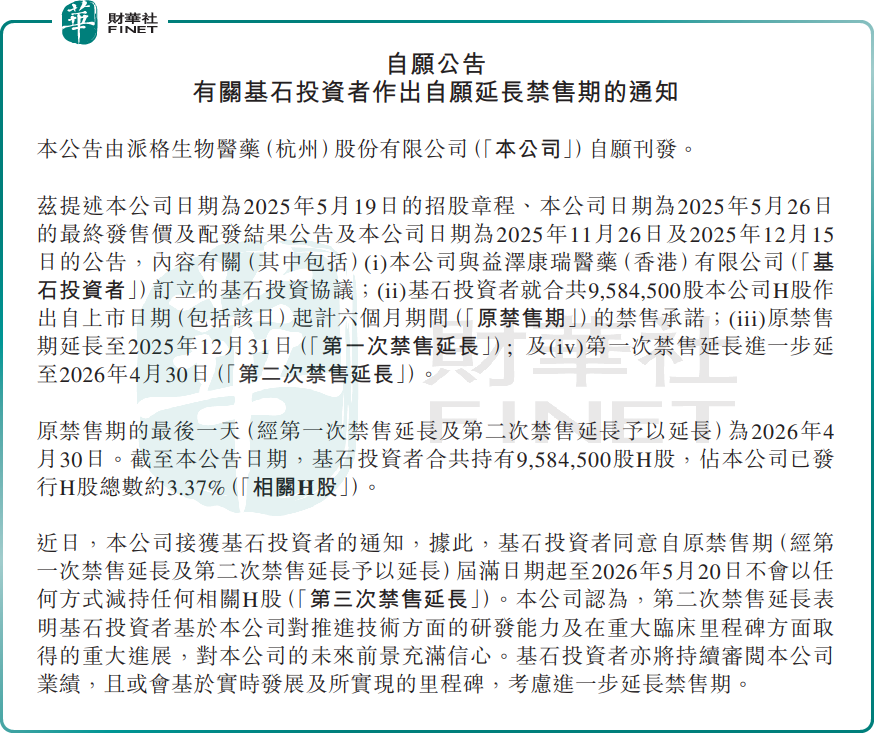4月28日,派格生物医药发布公告宣布,基石投资者益泽康瑞医药(香港)同意自原禁售期(经第一次禁售延长,及第二次禁售延长予以延长)届满日期(即2026年4月30)起至2026年5月20日,不会以任何方式减持任何相关H股(第三次禁售延长)。目前,基石投资者合共持有958.45万股,占H股总股本3.37%。