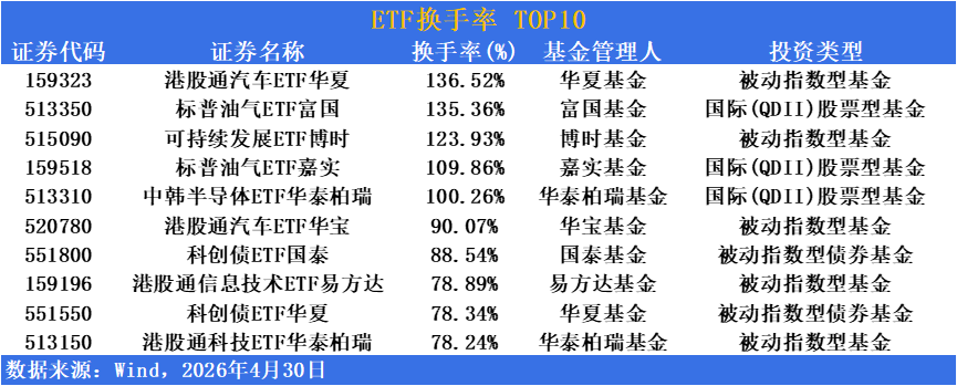 港股通汽车ETF华夏(159323)换手率超136%,港股通汽车ETF华宝(520780)换手率超90%,多只汽车主题产品集体活跃,反映资金对新能源汽车产业链的激烈博弈。标普油气ETF富国(513350)换手率超135%,标普油气ETF嘉实(159518)换手率超109%,显示资金对跨境油气资产的积极布局。中韩半导体ETF华泰柏瑞(513310)换手率超100%,港股通信息技术ETF易方达(159196)换手率超78%,港股通科技ETF华泰柏瑞(513150)换手率超78%,显示资金对港股科技成长及半导体赛道估值修复的积极布局。可持续发展ETF博时(515090)换手率超123%,反映资金对ESG主题及绿色转型赛道的关注升温。