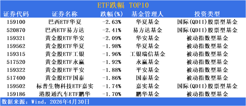 跌幅方面,黄金矿业板块高位回落,黄金矿业主题ETF集体回调