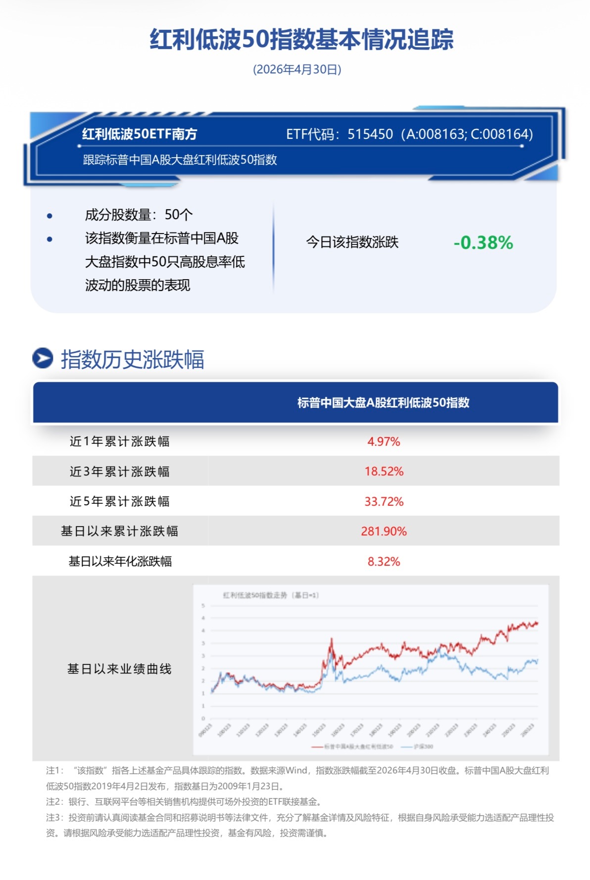截至2026年4月30日收盘,红利低波50ETF南方(515450)换手0.92%,成交1.59亿元,跟踪标的指数标普中国A股大盘红利低波50指数(SPCLLHCP.SPI) 跌-0.38%。